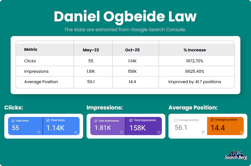 For example, Daniel Ogbeide Law used Search Console data to track:
